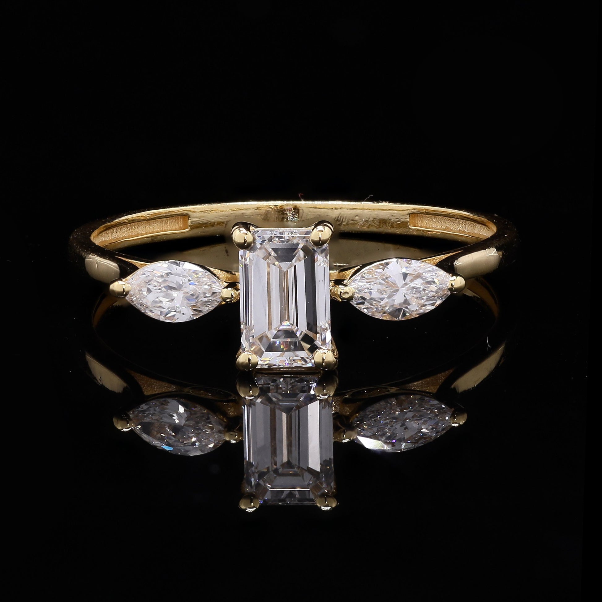 Exude timeless sophistication with this elegant 14k Gold Labgrown Diamond Ring, designed with a striking emerald-cut center stone flanked by two sparkling marquise diamonds. The three-stone arrangement beautifully symbolizes past, present, and future—making it the perfect choice for engagements or meaningful celebrations.